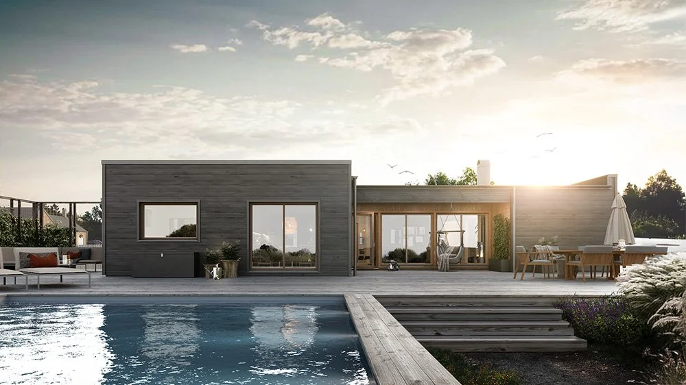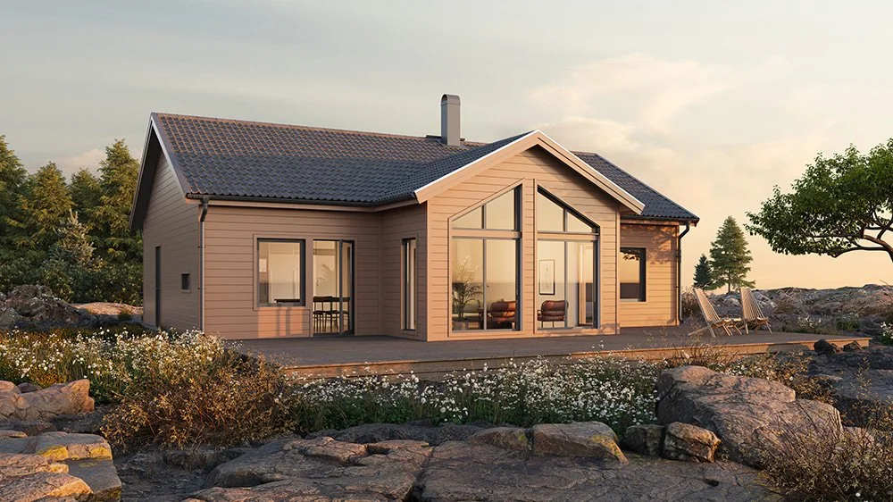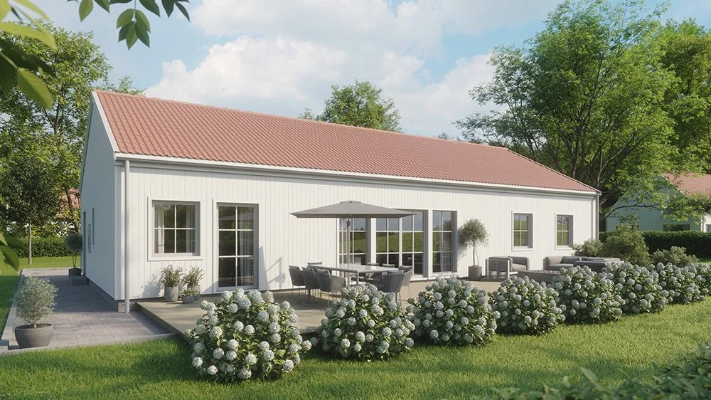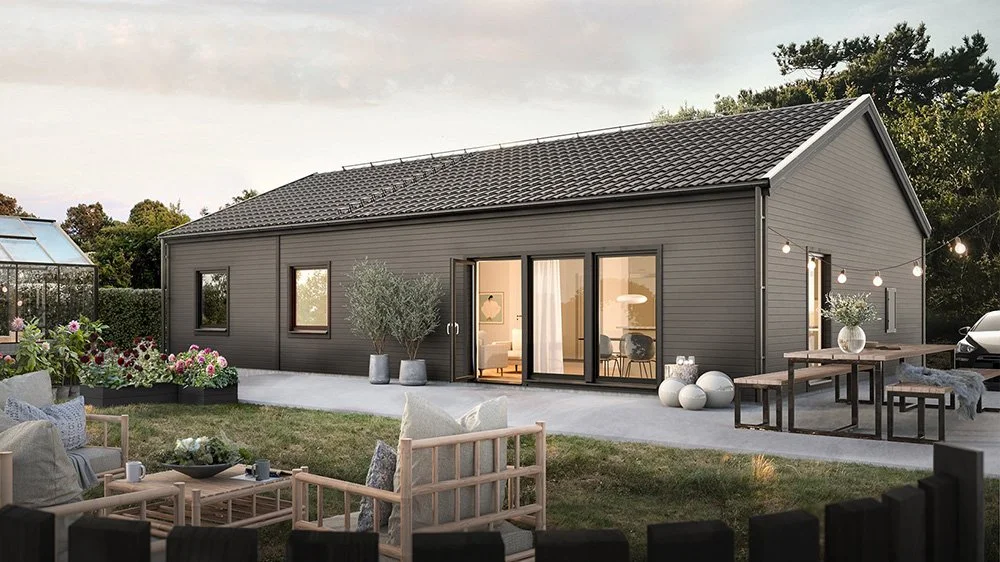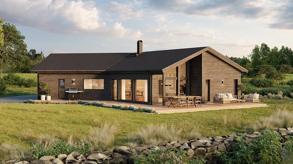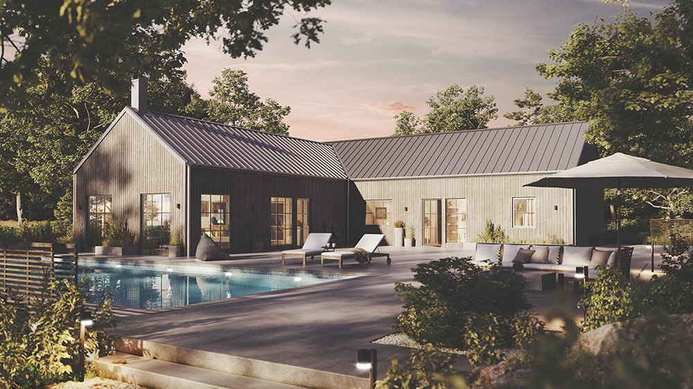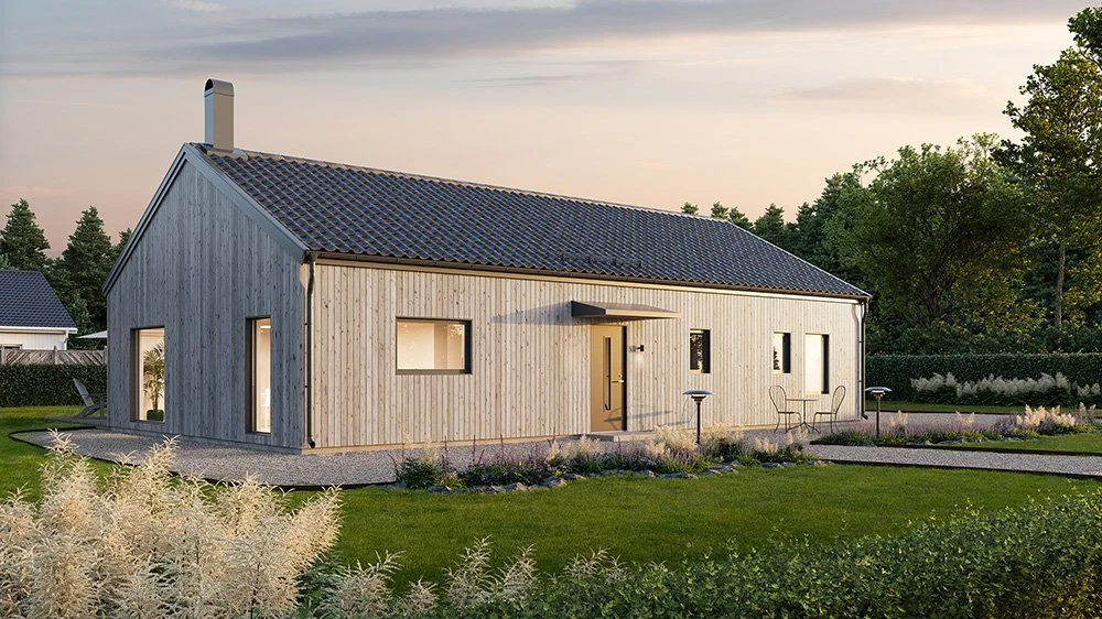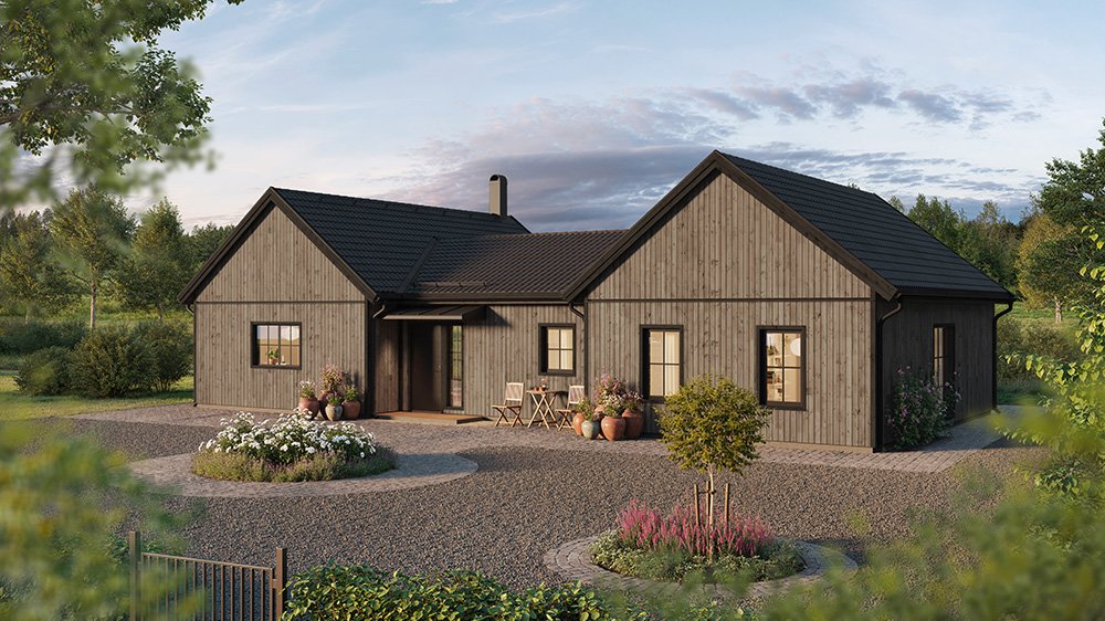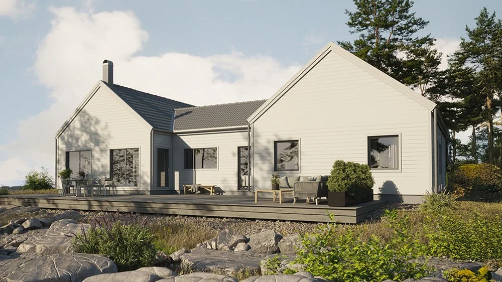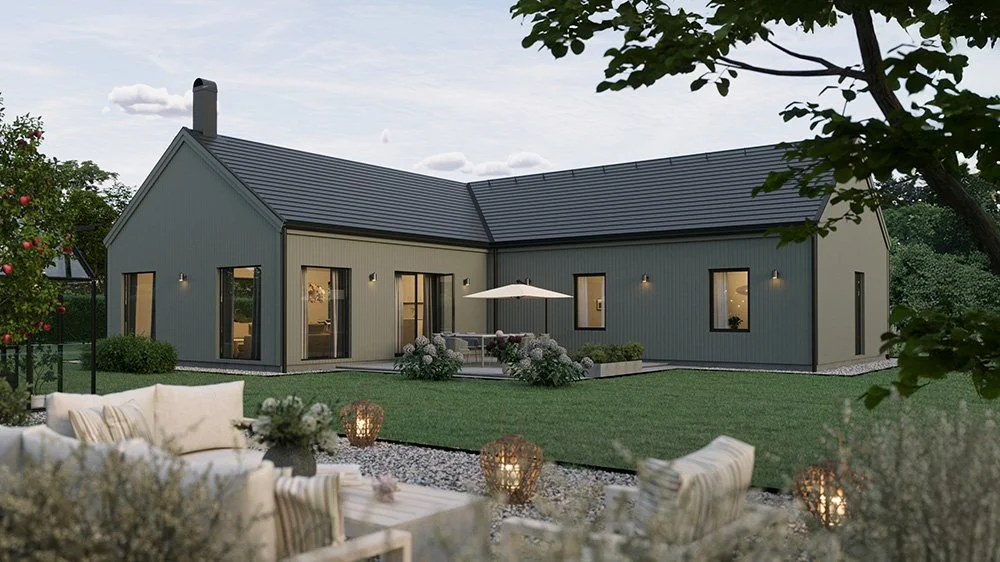Vi har märkt en ökad efterfrågan på enplanshus i vinkel och det finns flera fördelar med den här typen av husmodell. Ett vinkelhus kan bidra till ett härligt ljusinsläpp genom smarta placeringar av fönster och husets öppningar. Dessutom erbjuder ett vinkelhus en avskildhet som skyddar huset mot insyn. Genom att utnyttja vinkeln kan man skapa en trädgård, en uteplats eller en terrass som är mer privat och samtidigt ger en trevlig utomhusmiljö.