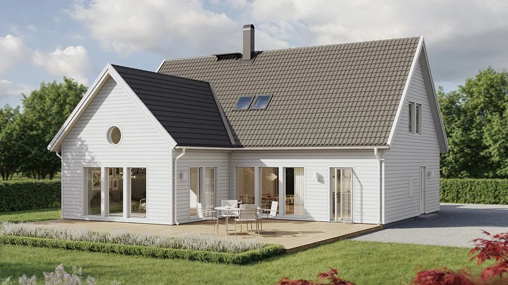 Med Villa Ekerö får ni ett modernt vinkelhus för den stora familjen på hela 195,6 m2. Med fem sovrum, öppna och stora sällskapsytor i vardagsrum och kök vågar vi lova att utrymme inte kommer att saknas. Med en härlig balkong på husets andra våning får ni möjlighet att ta del av kvällens sista solstrålar och samtidigt ett tak över uteplatsen. Med Villa Ekerö får ni ett kaxigt, lekfullt hus som både är fint att titta på och bo i. Klicka här för att läsa mer om husmodellen.